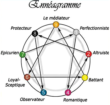 l'injustice et défend les faibles. Le "Profil 9" : le médiateur Mode de fonctionnement: Il est essentiellement préoccupé par la paix et l'harmonie, il évite les conflits et souhaite plus que tout vivre dans le calme et la sérénité. Il est stable, amical, bienveillant. Il a tendance à s'identifier à l'autre et à voir plutôt les choses selon le point de vue d'autrui. Il donne la sensation de bien savoir écouter: les profils 9 sont de bons conciliateurs et de bons conseillers. Il est souvent peu conscient de ses propres besoins et a du mal à défendre ses convictions, dire non, prendre des décisions et établir des priorités. Ses méthodes de contrôle face aux difficultés de la vie et aux épreuves consistent à ralentir. Passer du temps seul est important pour lui Émotions: sa colère est tournée vers l'intérieur, il la "réfrigère" afin de la contrôler et faire face à ses émotions. Il a appris à se déconnecter. Qualités: facile à vivre, patient, bon conseiller Stratégie de développement personnel: ce que chaque profil aurait avantage à développer. Le "Profil 1" Le perfectionniste aurait avantage à: - transformer les "je dois" en "je veux" - reconnaître et canaliser l'expression de la colère de manière appropriée - apprécier les valeurs d'autrui qui différent des siennes - être conscient et observer ses voix critiques internes - cultiver la patience et le sens de l'humour vis à vis du monde et d'eux mêmes - S'ouvrir à l'indulgence - développer la tendresse envers lui même et envers Les autres - se rappeler que dans la vie, le but est d'être soi même, non d être parfait Le "Profil 2" L'altruiste aurait avantage à: - apprendre à aider les autres de manière plus mesurée et adaptée - prendre conscience que son besoin d'aider est motivé par son besoin d'être aimé et apprécié - prendre conscience de l'importance qu'il accorde à son rôle et son image d'aidant - prendre conscience de l'importance de son désir de plaire aux autres - apprendre à être à l'écoute de ses propres besoins Le "Profil 3" Le battant aurait avantage à: - Apprendre à être plus authentique - plus laisser de place à ses émotions - relativiser la place de son travail dans sa vie. - prendre conscience de la place de ses sentiments - lâcher prise: ne pas être dans le faire - laisser les autres agir à leur manière - reconnaître que la vie peut être heureuse tout simplement, sans recherche de résultat ou but à atteindre: j'existe indépendamment de mes actes. Le "Profil 4" Le romantique aurait avantage à: - prendre conscience de son besoin d'attirer et de rejeter les gens - de sa peur d'être abandonné - comprendre ce qui le pousse à être "hors norme" - apprendre à vivre ici et maintenant - se répéter: " tout ce dont j'ai besoin est à ma porté" Le "Profil 5" L'observateur aurait avantage à: - trouver un équilibre entre la vie intellectuel, émotionnelle et physique. - plus valoriser ses émotions et ses sensations. - prendre conscience de sa tendance à se mettre en retrait et à se distancer des gens - accepter l'idée que les contact affectifs peuvent être aussi nourrissants que le savoir intellectuel. Le "Profil 6" : le loyal Le Loyal aurait avantage à: - développer sa confiance en lui et dans les autres - ne pas chercher les "intentions cachées" derrières les actes et les paroles, arrêter les projections - prendre conscience de son besoin de clarté. Lâcher prise en acceptant de - se recentrer dans son corps plutôt que dans sa tète - se rendre compte que la vie peut être heureuse, ici et maintenant - vivre dans le réel plutôt que dans l'imaginaire Le "Profil 7" L'épicurien aurait avantage à: - se concentrer sur ce qui est important pour lui, et prendre en compte ce qui est important pour les personnes qu'il côtoie - avoir confiance dans le présent et pas toujours dans le futur - reconnaître sa peur des contraintes - d'où vient sa frénésie de projets et prendre le temps - découvrir le plaisir de la lenteur. S'investir dans le présent, vivre l'ici et maintenant Le "Profil 8" Le chef aurait avantage à: - prendre conscience de ses excès - de ses colères - de son besoin de contrôler et quitter les rapports de force - ne plus avoir peur de montrer sa vulnérabilité - prendre en compte les sentiments des autres Le "Profil 9" Le chef aurait avantage à: - apprendre à agir d'après ses propre convictions - que de temps en temps, le conflit est utile pour clarifier les choses - sortir de son confort et de sa tranquillité. - cesser de se dévaloriser, faire confiance dans sa capacité à trouver son propre chemin